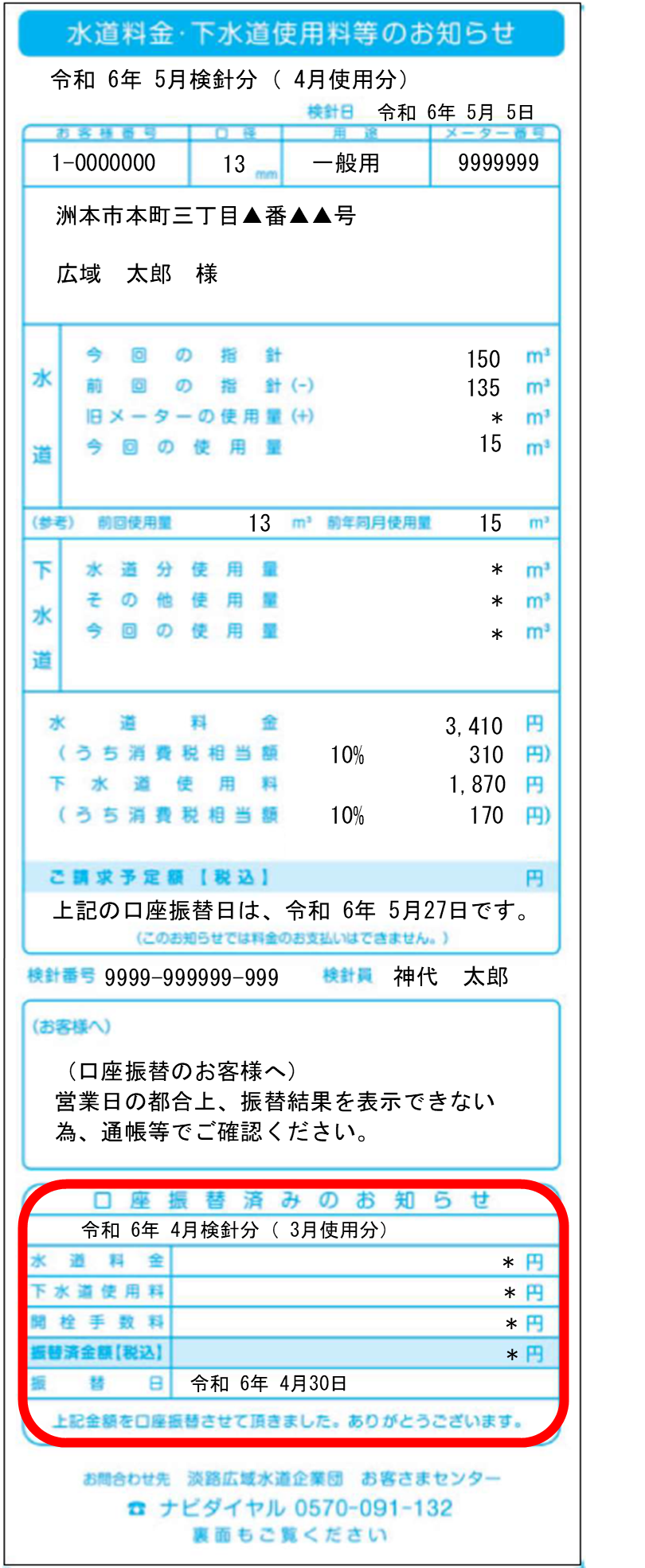 令和6年4月検針分(前月分)の口座振替結果は、営業日の関係上、口座振替結果が反映されず「*」表示となります。つきましては、振替結果は通帳にてご確認をお願いいたします。